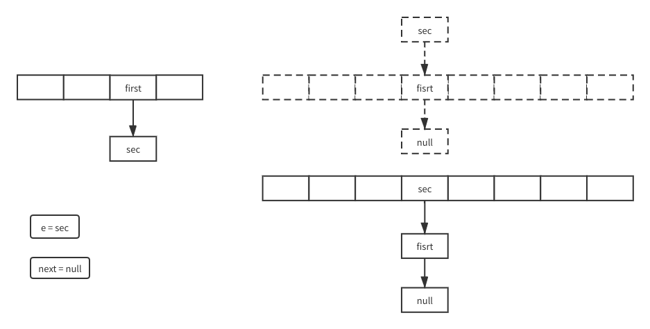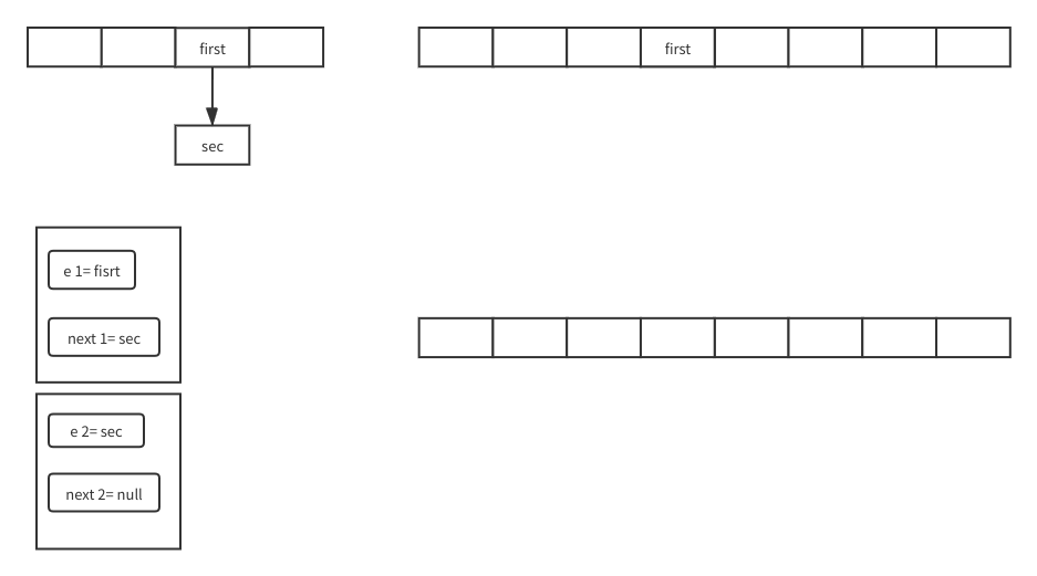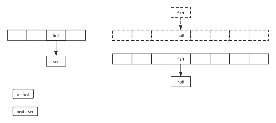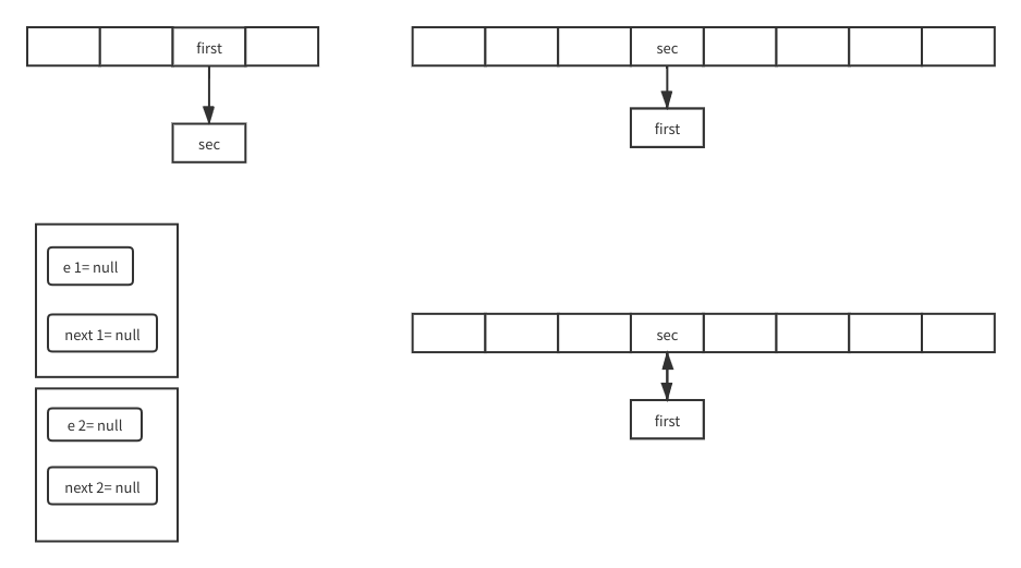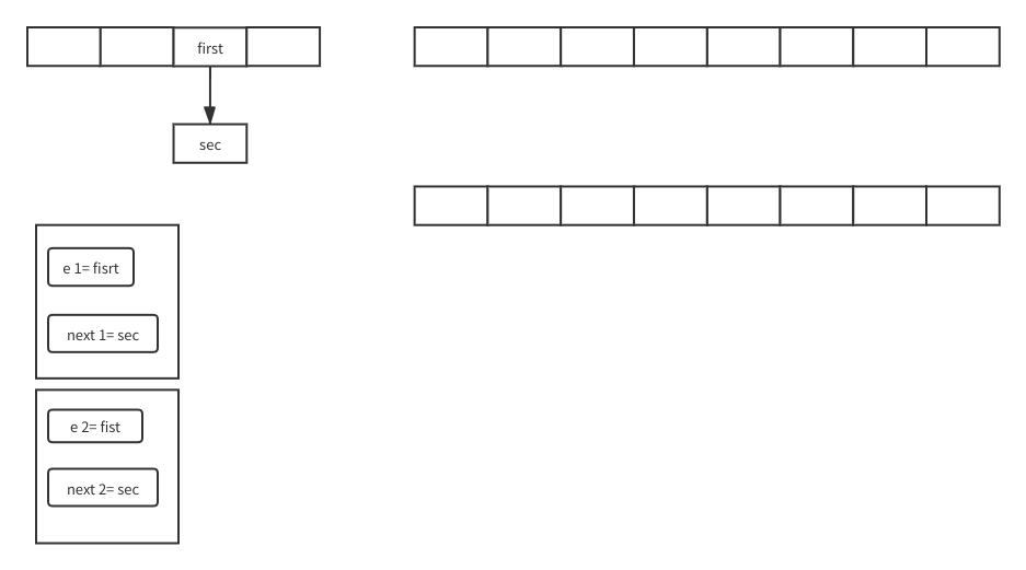 现在新数组就变成图中右下的样子了,可以看到就是sec的next变成first,first的next为空比起原先数组的关系就是反过来的。因为头插嘛第一个先插过去后面的插过去就更靠前第一个就是最下面。接下来e就是sec的next也就是遍历到第三个了然后没有下一个while结束,for循环下一个数组元素。就这样循环往复遍历所有的元素转移到新数组。