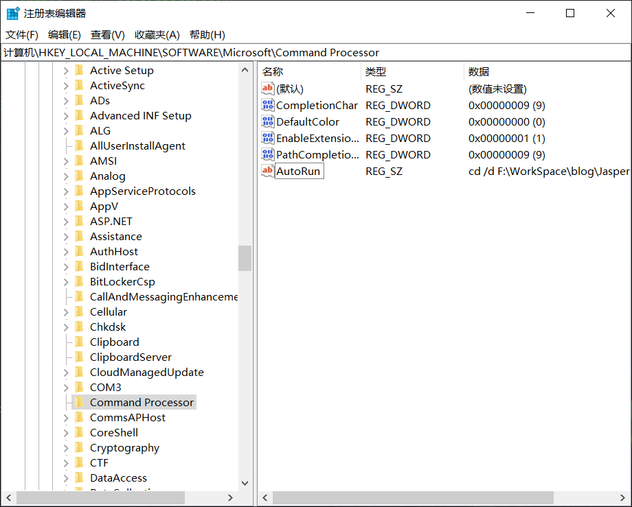 地址栏键入:HKEY_LOCAL_MACHINE\SOFTWARE\Microsoft\Command Processor