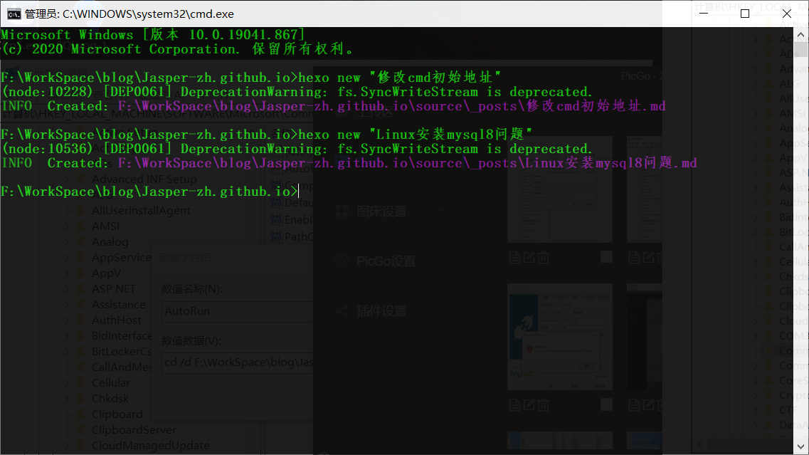 这里我已经创建了AutoRun的配置,开始是没有的。空白处右键新建字符串,名称AutoRun数值数据cd /d 你的地址
