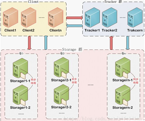 - storage集群采用分组的方式,同组内的每台服务器是平等关系,数据同步,目的是实现数据备份,从而高可用,而不同组的服务器之间是不通信的;
