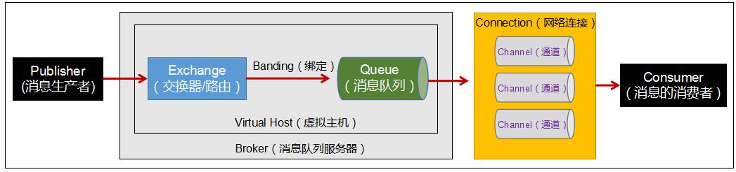 AMQP命令都是通过信道发出去的,不管是发布消息、订阅队列还是接收消息,都是通过信