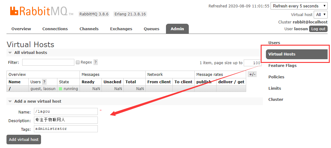- 每个vhost本质上就是一个mini版的RabbitMQ服务器,拥有自己的队列、交换器、绑定和权限机制