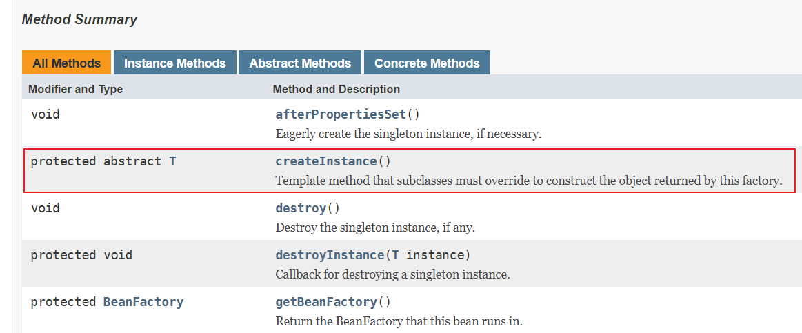 同样在Spring当中也有工厂方法模式的体现AbstractFactoryBean