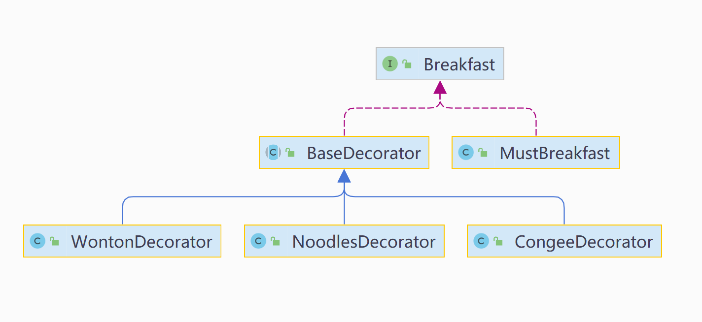 顶级早餐产品接口,之下具有两个实现一个是基础早餐,一个是对早餐进行装饰的抽象装饰器它和产品组件同属于一个抽象类型下。装饰器下有各种具体装饰器(馄饨、面条、粥)