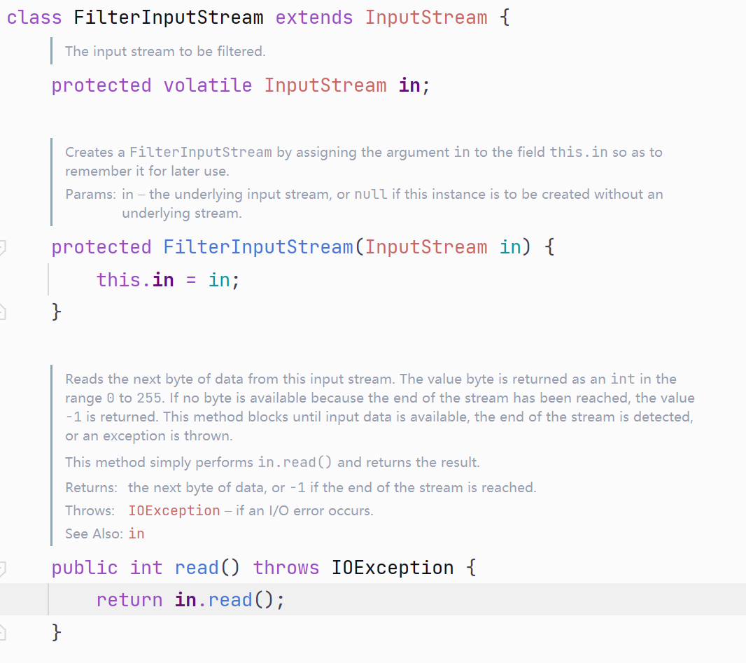 FilterInputStream内嵌InputStream且read()方法就是掉原组件方法,等于啥都没干。也就是扮演了基础装饰器的角色,而它的各个子类重写达到对原组件的不同扩展